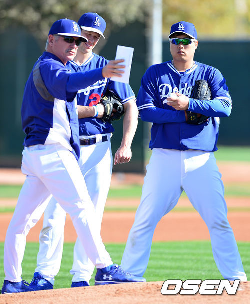 다저스 커쇼와 류현진의 코치의 설명을 듣고 있다.