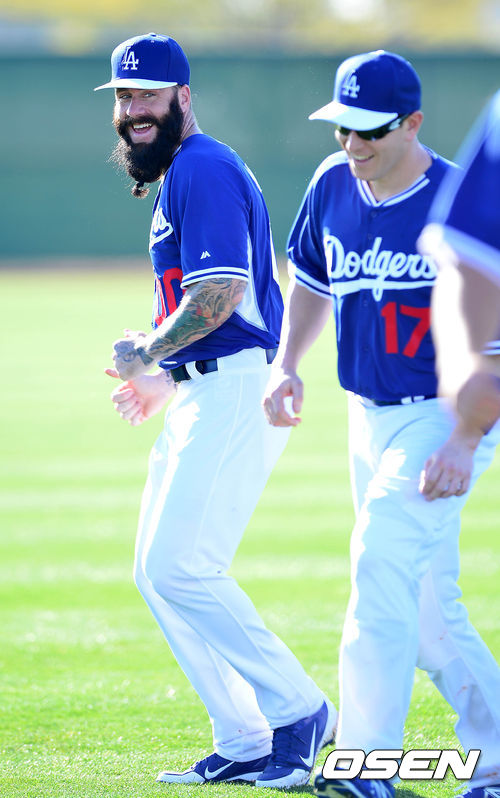 다저스 브라이언 윌슨이 A. J. 엘리스와 농담을 건네며 훈련을 하고 있다.