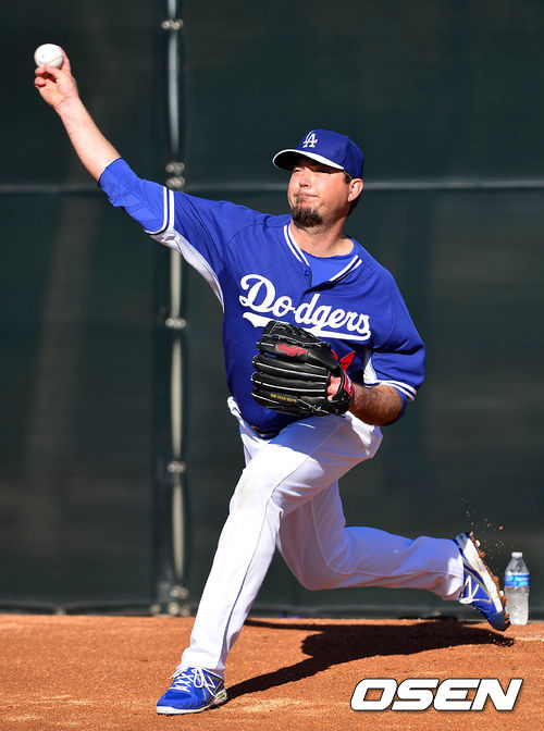 다저스 조시 베켓이 불펜 투구를 하고 있다.