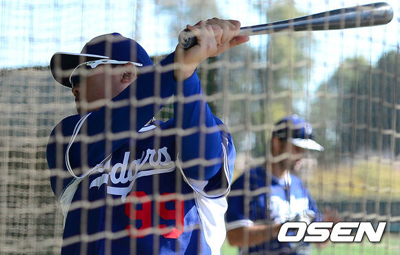 다저스 류현진이 타격 훈련을 하고 있다.
