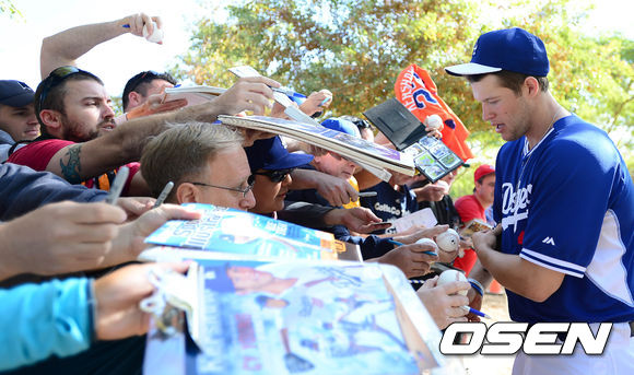 훈련을 마친 다저스 클레이튼 커쇼가 훈련장을 찾은 팬들에게 사인을 해주고 있다.