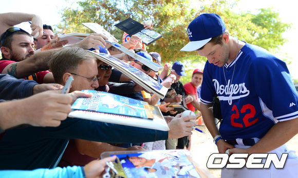 훈련을 마친 다저스 클레이튼 커쇼가 훈련장을 찾은 팬들에게 사인을 해주고 있다.