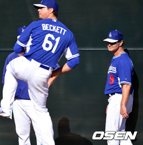 다저스 돈 매팅리 감독이 불펜 투구를 하는 조시 베켓을 바라보고 있다.
