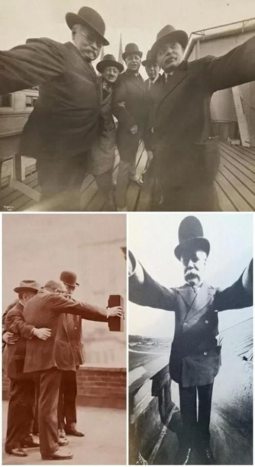 이와 함께 105년 전 셀카 사진이 어떻게 촬영됐는지 알 수 있는 모습을 담은 사진도 함께 공개됐다. 사진을 찍는 사람들 중 맨 끝의 두 사람이 한 손으로 각각 카메라를 맞잡고 들고 있어 당시 카메라가 얼마나 큰지 가늠할 수 있게 해준다.