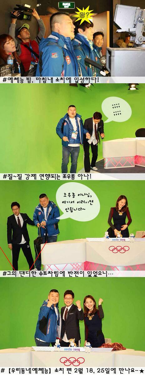 지난 10일 KBS 트위터에는 "예체능 팀 소치 입성. 강호동에게 딱 걸린 반전 패션 조우종 아나"라는 글과 사진이 게재됐다.
