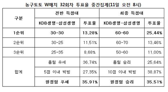2013-2014시즌 농구토토 W매치 32회차 투표율 중간집계 결과…두 팀 10점차 이내 접전 예상