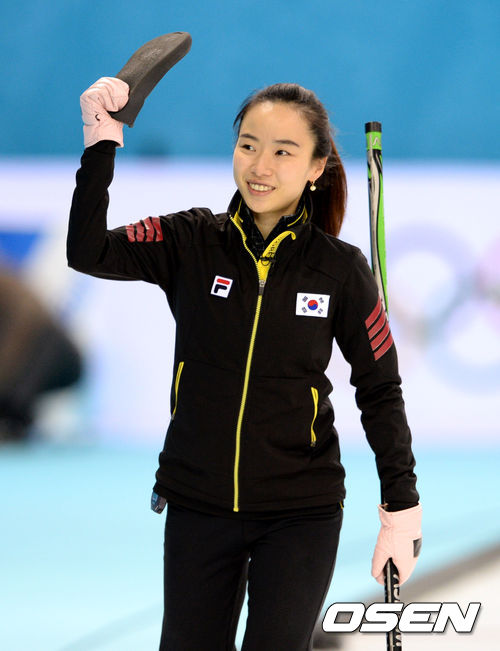 11일(한국시간) 러시아 소치 아이스큐브 컬링 센터에서 열린 여자컬링 예선전 한국과 일본과의 경기, 김지선이 미소짓고 있다.