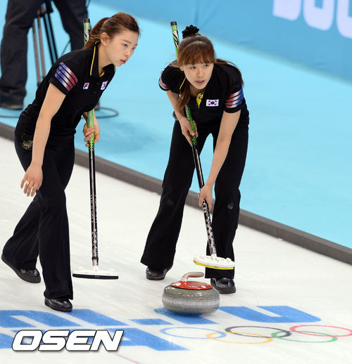 11일(한국시간) 러시아 소치 아이스큐브 컬링 센터에서 열린 여자컬링 예선전 한국과 일본의 경기, 이슬비 김은지가 스위핑을 하고 있다.