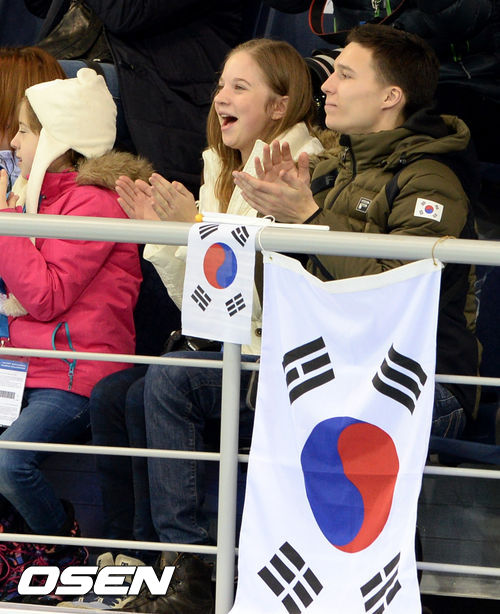 11일(한국시간) 러시아 소치 아이스큐브 컬링 센터에서 열린 여자컬링 예선전 한국과 일본의 경기, 외국인이 한국 태극기를 걸고 열띤 응원을 펼치고 있다.