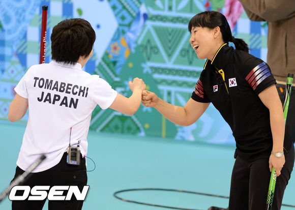 신미성(36)과 김지선(28) 이슬비(26) 김은지(25) 엄민지(23, 이상 경기도청)으로 구성된 여자 컬링 대표팀(세계랭킹 10위)은 11일(이하 한국시간) 러시아 소치의 아이스큐브 컬링센터에서 열린 컬링 라운드 로빈 세션 2 일본(세계랭킹 9위)와 경기서 12-7승리를 거두며 올림픽 첫 승의 기쁨을 누렸다.