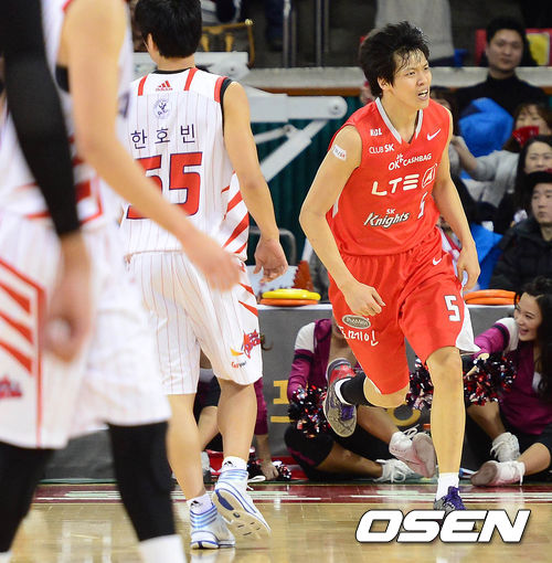 11일 오후 서울 잠실학생체육관에서 열린 '2013-2014 KB국민카드 프로농구' 서울 SK와 고양 오리온스의 경기 연장전 김선형이 슛을 성공시킨 후 벤치를 바라보고 있다.