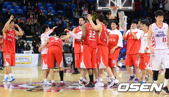 11일 오후 서울 잠실학생체육관에서 열린 '2013-2014 KB국민카드 프로농구' 서울 SK와 고양 오리온스의 경기 종료 후 SK 선수들이 승리를 기뻐하고 있다.
