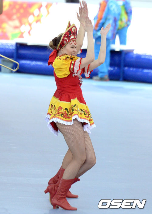 11일(한국시간) 러시아 소치 아들레르 아레나 경기장에서 열린 2014 소치동계올림픽 스피드스케이팅 여자 500m 1차전에 공연이 펼쳐지고 있다.