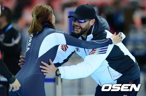 이상화,케빈 오벌랜드 코치와 금빛 포옹