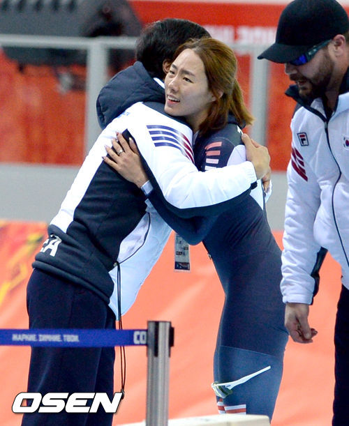 올림픽 2연패 이상화,'금빛 포옹! 눈물 펑펑'
