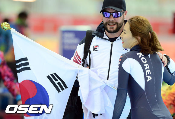 올림픽 2연패 이상화,'케빈 코치에게 안겨'
