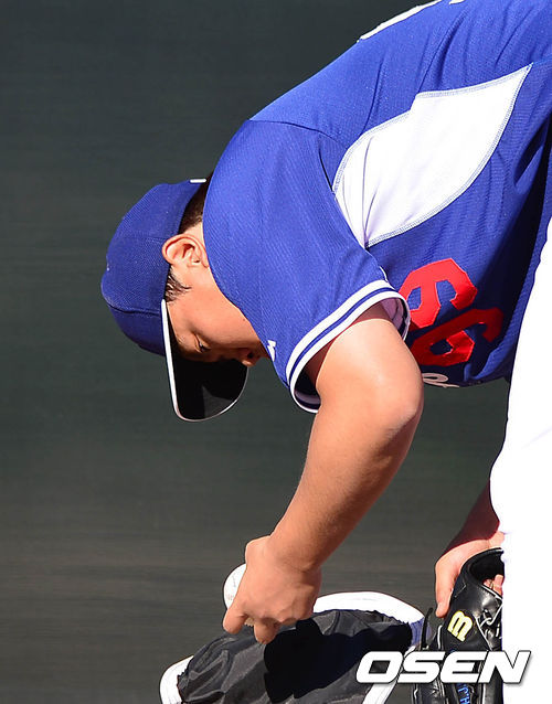 다저스 류현진이 불펜 투구를 준비하고 있다.