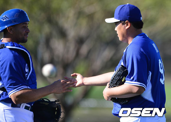 불펜 투구를 마친 다저스 류현진이 포수 미구엘 올리보와 인사를 나누고 있다.