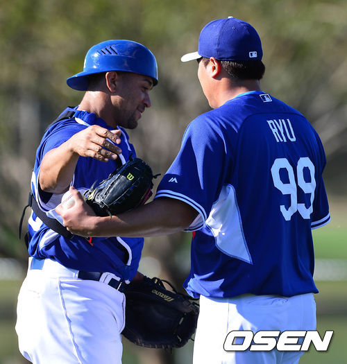 불펜 투구를 마친 다저스 류현진이 포수 미구엘 올리보와 인사를 나누고 있다.