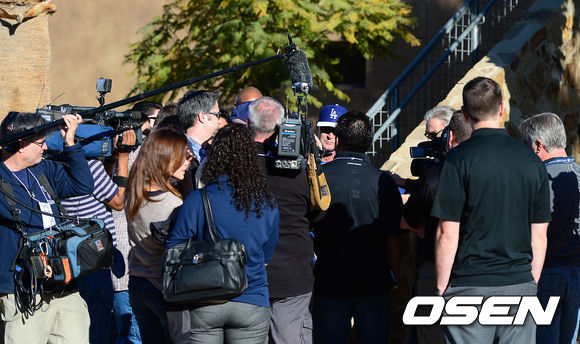 훈련에 앞서 다저스 돈 매팅리 감독이 취재진과 이야기를 나누고 있다.