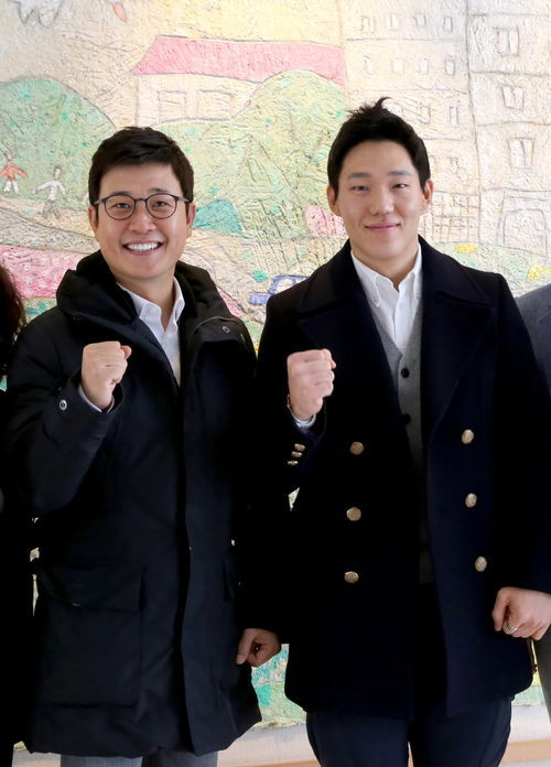 12일 MBC가 공개한 사진 속 두 사람은 나란히 응원의 손 동작을 하며 웃고 있다. 김성주는 이날 오후 10시 40분에 MBC에서 중계방송되는 2014 소치 동계올림픽 스피드스케이팅 남자 1000m 경기에서 캐스터로 나선다.