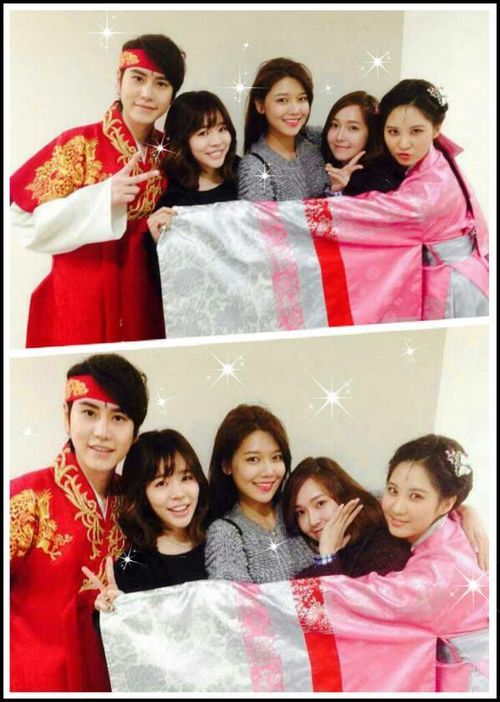 [OSEN=김사라 인턴기자] 슈퍼주니어 규현과 소녀시대 서현이 뮤지컬 응원을 온 소녀시대 멤버들과 훈훈한 인증 사진을 찍었다.