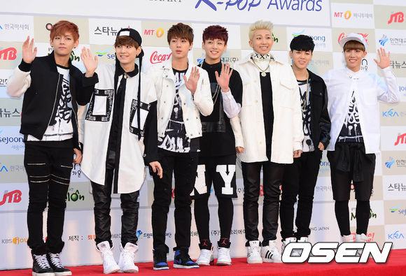 12일 오후 서울 방이동 올림픽공원 체조경기장에서 열린 '제3회 가온차트 K-POP 어워드' 레드카펫 행사에서 방탄소년단이 포토타임을 갖고 있다.