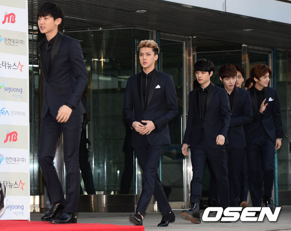 12일 오후 서울 방이동 올림픽공원 체조경기장에서 열린 '제3회 가온차트 K-POP 어워드' 레드카펫 행사에 엑소가 참석하고 있다.