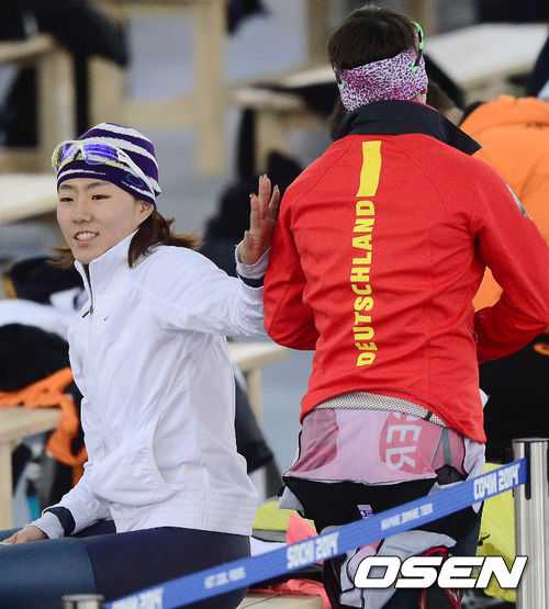 스피드 스케이팅 대표팀 이상화가 12일(한국시간) 러시아 소치 아들레르 아레나에서 훈련을 하며 독일 예니 볼프의 축하를 받고 있다.