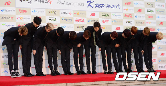 12일 오후 서울 방이동 올림픽공원 체조경기장에서 열린 '제3회 가온차트 K-POP 어워드' 레드카펫 행사에서 엑소가 포토타임을 갖고 있다.