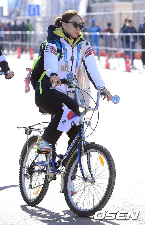 스피드 스케이팅 대표팀 이상화가 12일(한국시간) 러시아 소치 아들레르 아레나에서 훈련을 마치고 자전거를 타고 숙소로 향하고 있다.