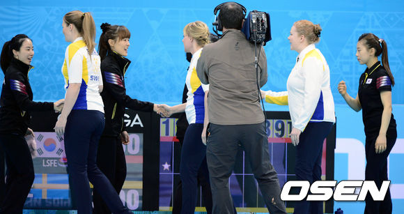 신미성(36)과 김지선(28) 이슬비(26) 김은지(25) 엄민지(23, 이상 경기도청)으로 구성된 여자 컬링 대표팀(세계랭킹 10위)이 12일(한국시간) 러시아 소치의 아이스큐브 컬링센터에서 스웨덴과 3차전을 가졌다.
