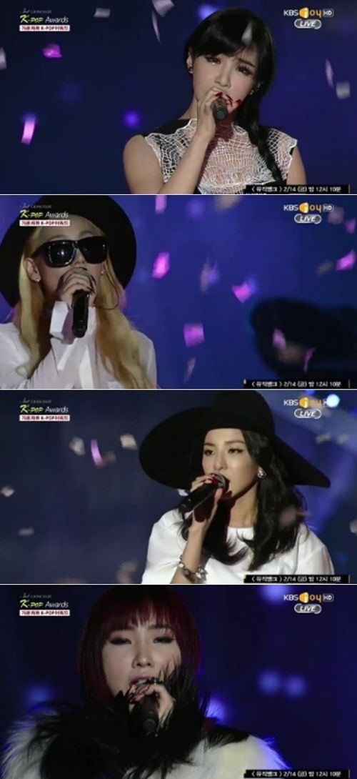 2NE1은 12일 오후 서울 방이동 올림픽공원 체조경기장에서 진행된 가온차트 K팝 어워드에서 '그리워해요'를 부르며 축하 공연을 펼쳤다. 멤버들은 복고풍으로 디자인된 모자, 선글라스 등을 소화하며 매혹적인 모습을 보였다.