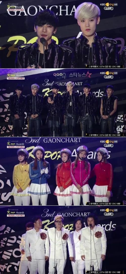 B.A.P, 크레용팝은 12일 서울 올림픽공원 체조경기장에서 열린 제3회 가온차트 K-POP 어워드에서 각각 올해의 발견상 월드루키, 핫 트렌드 부문 수상자로 무대에 올랐다. 밴드 장미여관은 인디 부문 올해의 수상자로 선정됐다.