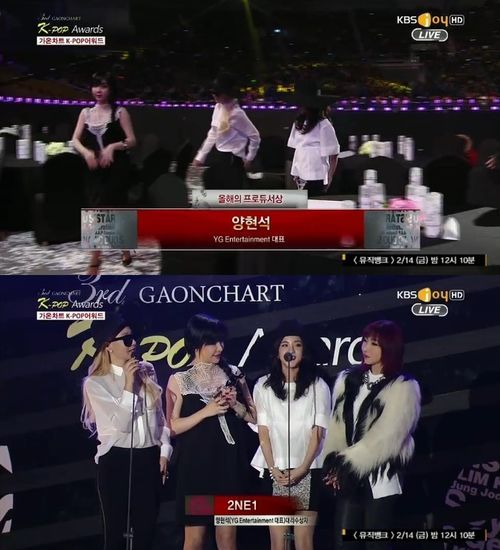 양현석은 12일 서울 올림픽공원 체조경기장에서 열린 제3회 가온차트 K-POP 어워드에서 올해의 프로듀서상의 수상자로 호명됐으나 이 자리에 불참, YG 소속 아티스트 2NE1이 대신 무대에 올랐다.