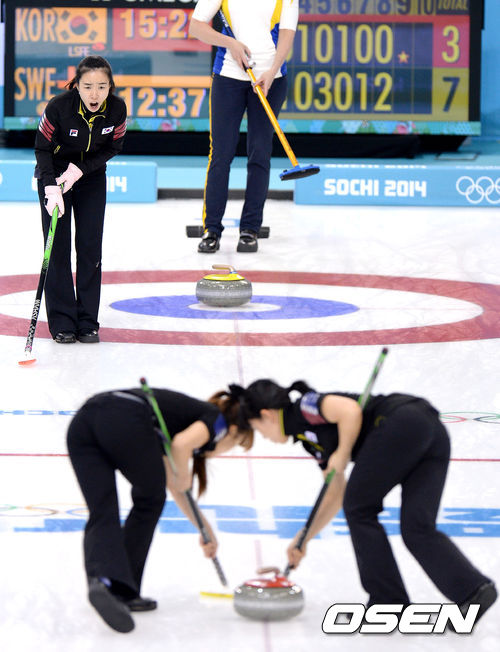 신미성(36)과 김지선(28) 이슬비(26) 김은지(25) 엄민지(23, 이상 경기도청)으로 구성된 여자 컬링 대표팀(세계랭킹 10위)이 12일(한국시간) 러시아 소치의 아이스큐브 컬링센터에서 스웨덴과 3차전을 가졌다.