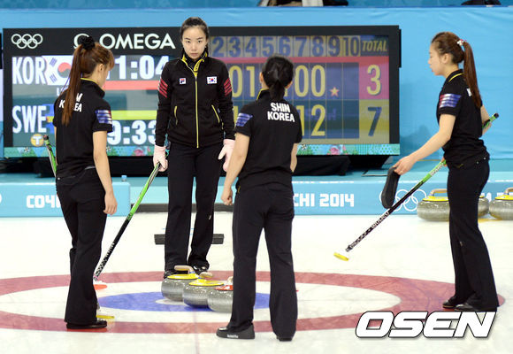 신미성(36)과 김지선(28) 이슬비(26) 김은지(25) 엄민지(23, 이상 경기도청)으로 구성된 여자 컬링대표팀(세계랭킹 10위)은 12일(한국시간) 러시아 소치의 아이스큐브 컬링센터에서 컬링 라운드 로빈 세션 4 스웨덴(세계랭킹 1위)전서 4-7로 패했다.