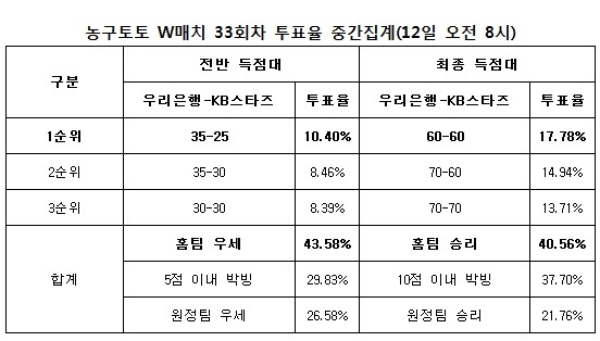 국민체육진흥공단(www.kspo.or.kr)이 발행하는 체육진흥투표권 수탁사업자인 스포츠토토 공식 온라인 발매사이트인 베트맨(www.betman.co.kr)이 오는 13일 오후 7시 춘천호반체육관에서 벌어지는 우리은행-KB스타즈전을 대상으로 한 농구토토 W매치 33회차 투표율을 중간 집계한 결과, 전체 참가자의 40.56%는 우리은행의 승리를 예상하는 것으로 나타났다.