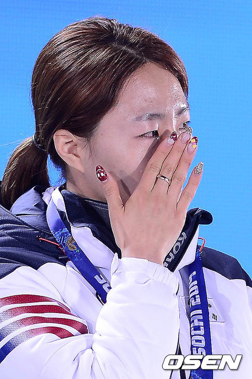 금메달을 차지한 이상화가 눈물을 흘리고 있다