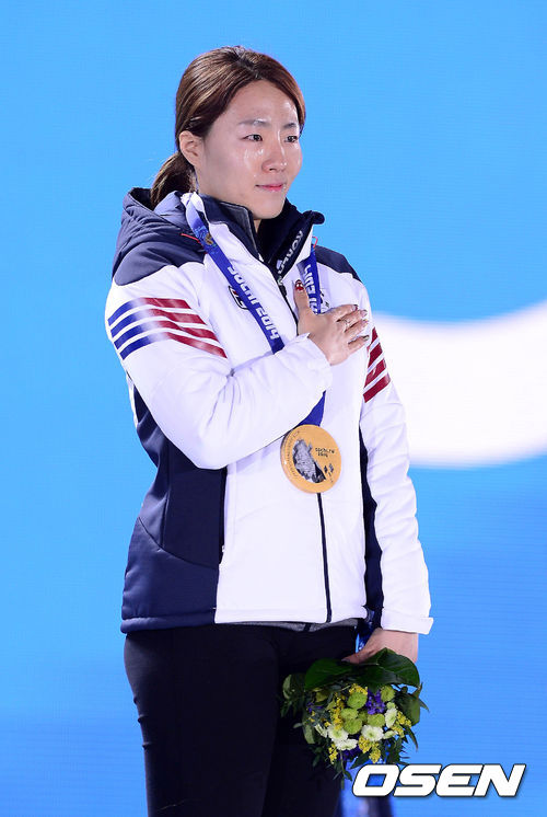 금메달을 차지한 이상화가 시상식에서 눈물을 흘리고 있다