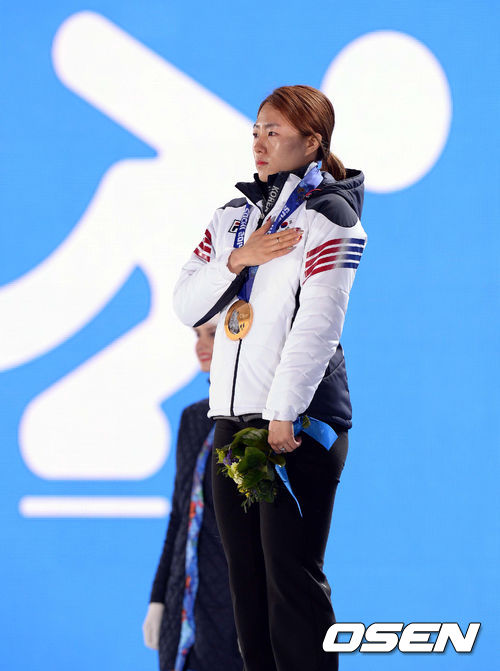 금메달을 차지한 이상화가 시상식에서 눈물을 흘리고 있다
