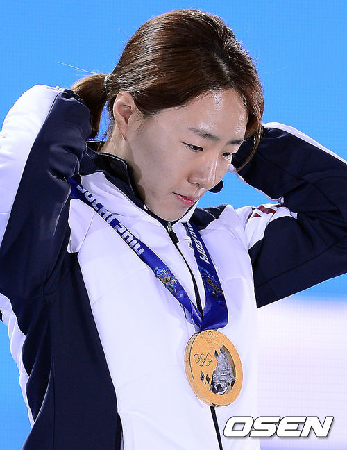 이상화가 금메달을 목에 걸고 생각에 잠겨 있다