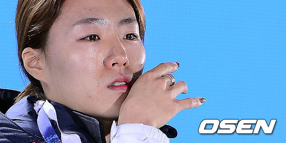 금메달을 차지한 이상화가 눈물을 흘리고 있다