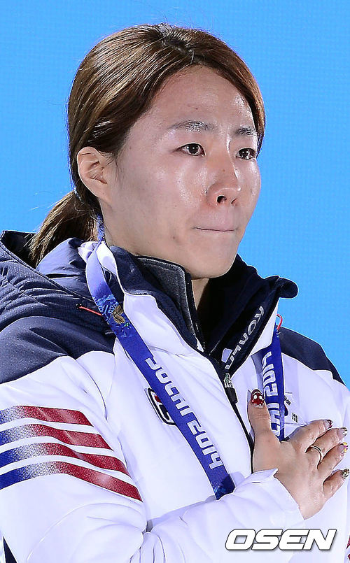 금메달을 차지한 이상화가 애국가를 들으며 생각에 잠겨 있다