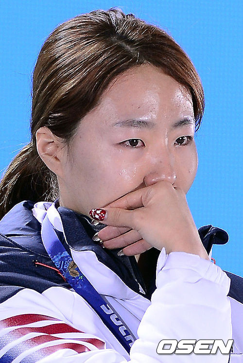 금메달을 차지한 이상화가 눈물을 흘리고 있다