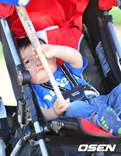 부모와 함께 훈련장을 찾은 어린아이가 배트를 들고 장난을 치고 있다.