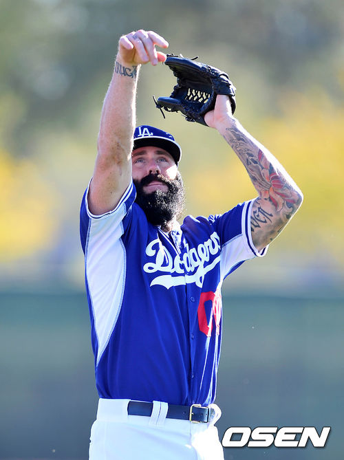 캐치볼을 마친 다저스 브라이언 윌슨이 농구 슛동작을 취하고 있다.