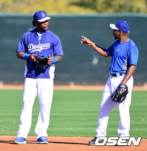 다저스 헨리 라미레즈가 동료와 이야기를 나누고 있다.