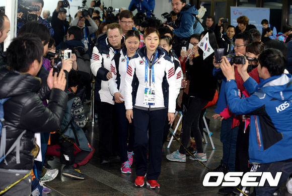 13일(한국시간) '피겨여왕' 김연아, 김해진, 박소연이 러시아 소치 아들레르 공항에 도착, 입국장을 나서고 있다.