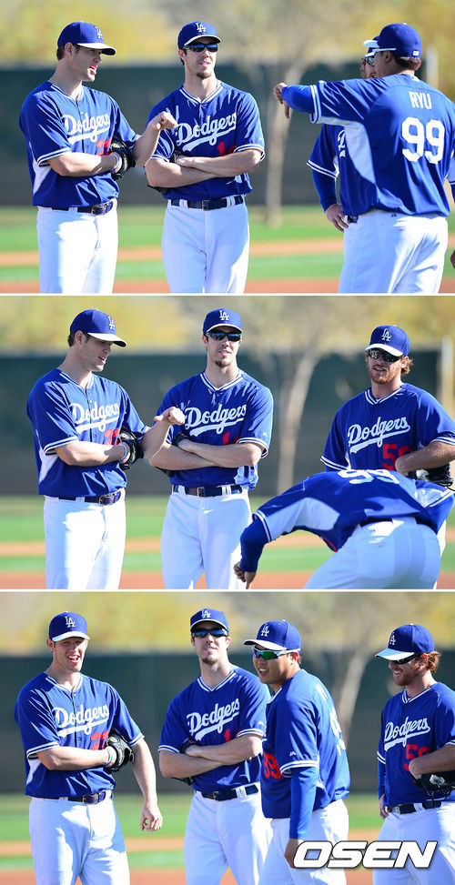 다저스 류현진이 훈련중 동료들과 이야기를 나누며 환하게 웃고 있다.